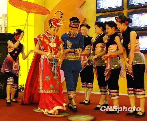 圖為畬族寶塔茶文化婚俗慶典在海峽兩岸茶博會坦洋功夫館上熱鬧上演。中新社發(fā) 王東明 攝