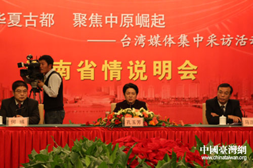 中國臺灣網(wǎng)11月28日消息 “走進(jìn)華夏古都,聚焦中原崛起——臺灣媒體集中采訪活動”今天在河南省鄭州市啟動。河南省委常委、宣傳部長、副省長孔玉芳向包括9家臺灣媒體在內(nèi)的兩岸媒體記者介紹豫臺交流情況以及“中原文化寶島行”的相關(guān)內(nèi)容。