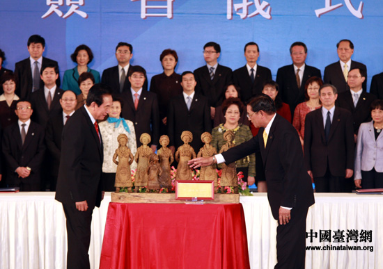 12月21日下午,海協會會長陳云林與;鶗麻L江丙坤正式簽署《海峽兩岸醫藥衛生合作協議》,雙方并在協議簽署后互贈禮品。圖為;鶗沦浐f會方面的陶土作品《齊心傳唱 和諧天籟》。(中國臺灣網 鐘寶華 攝)