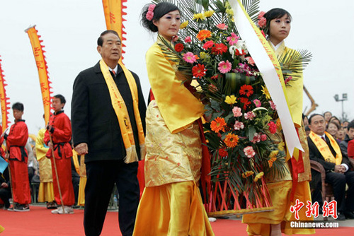 4月5日上午,中國·洪洞二十一屆大槐樹尋根祭祖大典在山西洪洞大槐樹尋根祭祖園舉行,中國臺灣親民黨主席宋楚瑜參加大典。圖為親民黨主席宋楚瑜祭祖敬獻(xiàn)花藍(lán)。中新社發(fā) 張?jiān)?攝