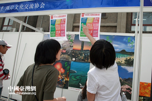 圖為北京大學兩岸文化交流協會展位的招貼海報吸引了學生駐足咨詢。(中國臺灣網 普燕 攝)