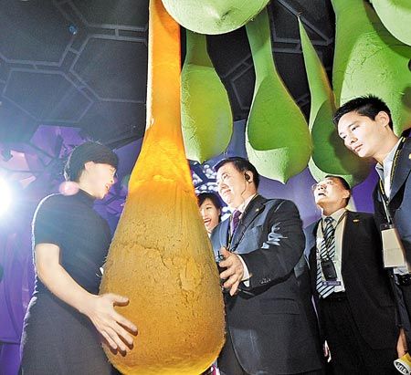 率團赴臺參訪的安徽省長王三運(中)18日下午前往臺北花卉博覽會,在導覽員解說下,王三運在夢想館內透過科技與植物互動,并體驗全方位觀影經驗與感官震撼。圖片來源:臺灣中國時報 劉宗龍攝