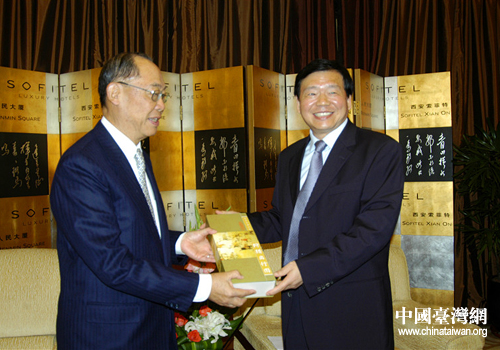 陜西省常務(wù)副省長(zhǎng)婁勤儉向臺(tái)灣太平洋文化基金會(huì)董事長(zhǎng)錢復(fù)贈(zèng)送禮品。(陜西省臺(tái)辦 張群莉 攝)