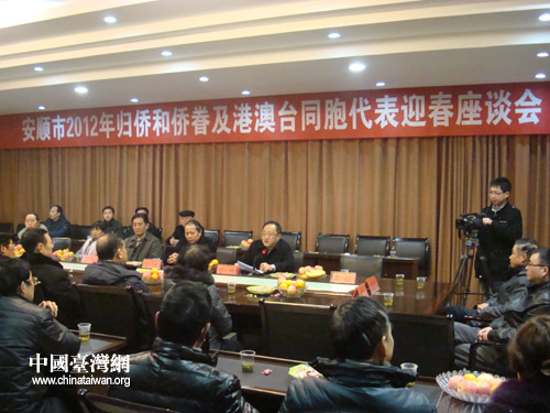 中國臺灣網1月6日安順消息 2012年元月4日,貴州省安順市歸僑和僑眷及港澳臺同胞代表迎春座談會召開。安順市委副書記管群代表安順市委、市人大、市政府、市政協向安順市廣大歸僑僑眷、港澳臺同胞及眷屬致以節日的祝福和親切的問候。