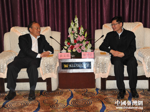 廣西壯族自治區(qū)副主席藍(lán)天立(右)在南寧會見臺北世界貿(mào)易中心黃文榮副秘書長。(圖片來源:南寧臺辦)