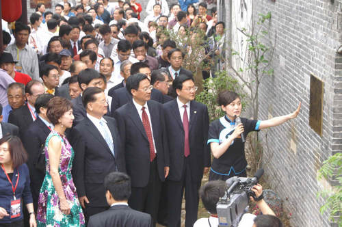 中央臺辦副主任陳元豐,海協會副會長李炳才,省委副書記、省政協主席劉偉,省委常委、宣傳部部長李群,中國國民黨榮譽主席連戰和夫人連方瑀等為泰和樓奠基。山東省委副書記、省政協主席劉偉在致辭中對棗莊市恢復重建臺兒莊古城工作給予了充分肯定,他說:“臺兒莊古城的重建是一件很有意義的事情,海峽兩岸交流基地的建設必將促進兩岸關系的和平發展!敝袊鴩顸h榮譽主席連戰則高度評價了中共棗莊市委、棗莊市人民政府為推動兩岸交流工作所做出的努力,他希望海峽兩岸交流基地深化交流,共同合作。