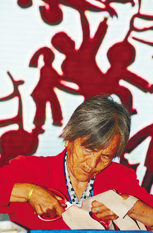 圖為非遺中國(guó)剪紙傳承人王桂英(徐州)展示剪紙絕技。(余萍 攝)