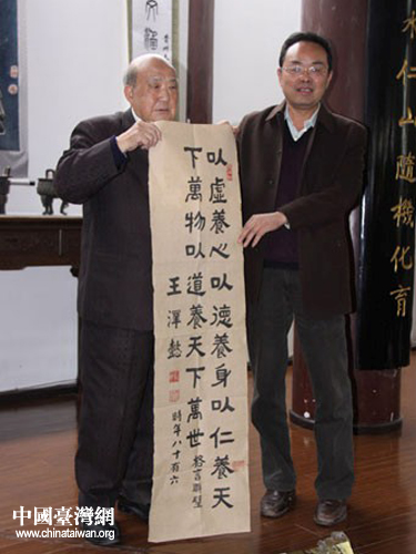 捐贈儀式上,臺灣老藝術家王萍老先生向貴州大學捐贈了一幅大橫山水畫、一幅對聯和一幅清代古萱紙橫幅。王萍老先生說:“我的家鄉在貴州省大方縣,背井離鄉數十載,對家鄉的思念常常難掩于面。這次捐贈的作品里有一橫幅所用之紙有三百多年歷史,僅我個人就保存了五十余載,我始終想著要把最好的獻給自己的家鄉。今天將它捐贈給貴校,終于了我心愿。”其余的臺灣書畫藝術家也紛紛將隨行所帶之墨寶贈予貴州大學。