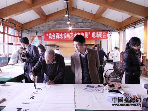 中國臺灣網11月7日貴陽消息 日前,參加“筑臺兩地書畫藝術交流展”的兩地書畫藝術家,齊聚風景秀美的花溪鎮山布依族村寨開展現場筆會,在“中國·貴州花溪鎮山布依族生態博物館”內,切磋技藝、交流感情、揮豪潑墨、共抒情懷。(中國臺灣網貴陽市臺辦通訊員 胡珊珊)