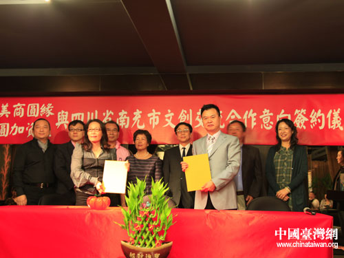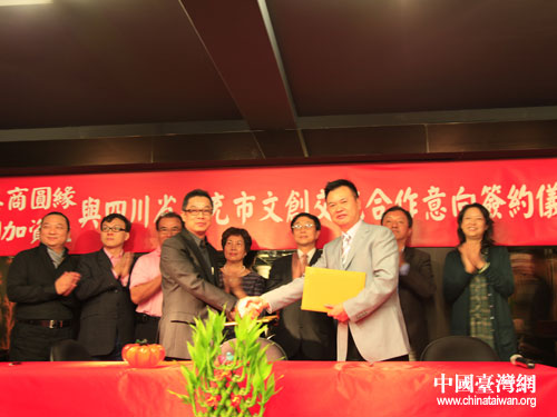 南充市文化創(chuàng)意訪問團(tuán)與臺(tái)灣“圓加資產(chǎn)有限公司”公司簽約儀式。圖片來(lái)源:南充市臺(tái)辦