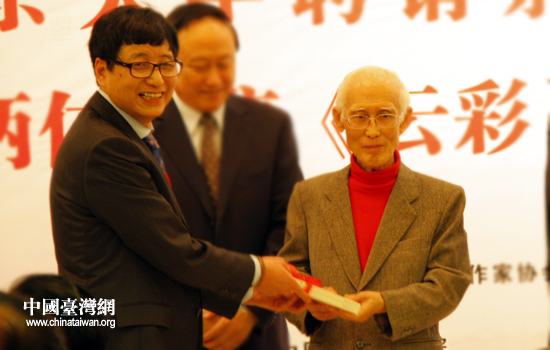 20日,“詩與海峽:余光中、朱炳仁詩會系列交流活動”在北大舉行。圖為朱炳仁向余光中贈送詩集《云彩》。(中國臺灣網 張瑞宸 攝)