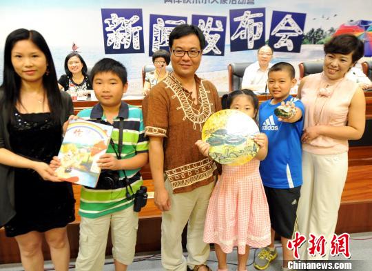 參加“2013?陽光海峽——兩岸快樂小天使活動營” 新聞發布會的3位福建小營員代表及家長共同展示,屆時將贈送臺灣小天使的禮物。 劉可耕 攝