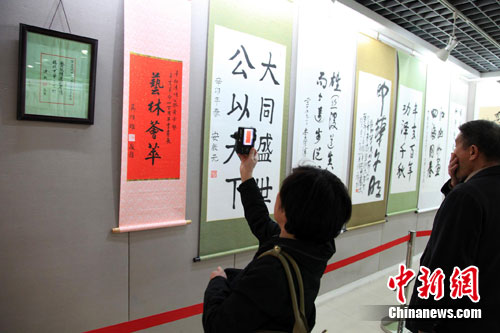 中新社西安4月3日電 (冽瑋 張遠)4月3日,辛卯年(第四屆)清明公祭軒轅黃帝暨紀念辛亥革命100周年海峽兩岸名家書畫展在西安舉行,共展出兩岸名家書畫作品328幅。中國國民黨榮譽主席連戰、吳伯雄分別為書畫展題詞祝賀。