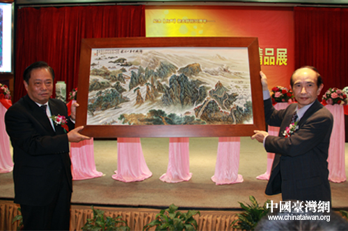 兩岸藝術家攜手共繪兩塊“錦繡中華山河圖”陶瓷板畫,分別贈與大陸和臺灣的博物館收藏。(中國臺灣網 郜利敏 攝)
