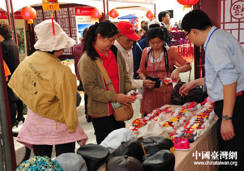 首屆“高雄市燈會藝術節暨北京特色周”,臺灣民眾購買北京傳統手工布鞋。(資料圖片)