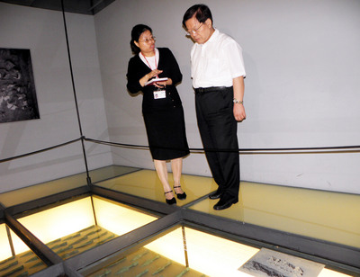 大陸文化部長蔡武(右)2日參訪臺“中研院”史研所的歷史文物陳列館,仔細聽館方人員解說。