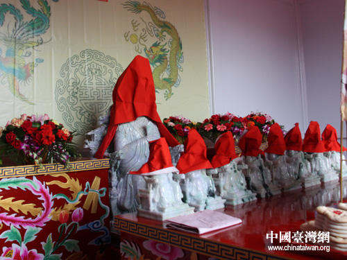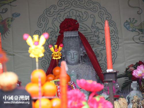 10日下午,湄洲媽祖祖廟受贈(zèng)翡翠媽祖像儀式,在莆田市湄洲島天后廣場(chǎng)舉行,圖為開光典禮前的翡翠媽祖像。(中國(guó)臺(tái)灣網(wǎng) 楊麗 攝)