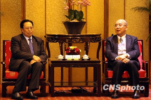 中國國民黨榮譽主席吳伯雄十二月十四日在臺北圓山飯店,會見中共中央委員、原河南省委書記徐光春所率河南省訪問團。 中新社發(fā) 曾嘉 攝