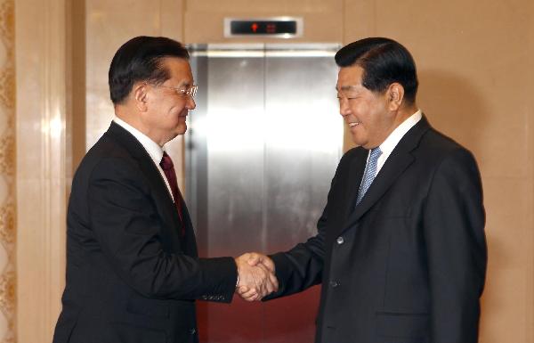 5月7日,中共中央政治局常委、全國政協主席賈慶林在北京人民大會堂會見中國國民黨榮譽主席連戰和夫人及隨行人員。 新華社記者劉衛兵攝