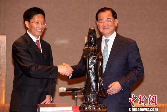 圖為鐘勉(左)贈(zèng)送用四川特有木化石制作的觀音菩薩像,與連戰(zhàn)握手。 董會(huì)峰 攝