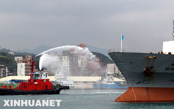 2008年12月15日,即將遠航的船舶接受噴水祝福。當日,臺灣萬海航運、陽明海運、臺灣航業、福建華榮等4家航運公司聯合舉辦的兩岸海運直航基隆首航儀式在臺灣基隆港舉行。新華社記者 陳斌華攝