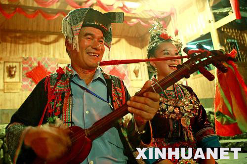 8月13日,在廣西桂林市龍勝各族自治縣大唐灣民族村,來自臺灣的一位少數民族同胞(左)體驗侗家“坐夜”民俗。 當日,參加“2009桂臺少數民族交流周”的臺灣少數民族同胞,來到廣西龍勝縣大唐灣民族村當地少數民族群眾進行民俗文化交流,增進兩岸同胞的相互了解和情誼。新華社發(龍濤 攝)
