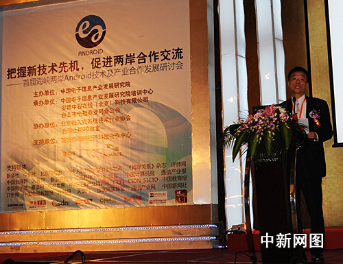 圍繞開源手機操作系統Android技術與應用的首屆“海峽兩岸Android技術及產業合作發展研討會”,十五日在北京舉行。來自兩岸的專家及業者代表五百多人參加了會議。圖為臺北市電腦公會副總干事張笠在會上發言。 路梅 攝