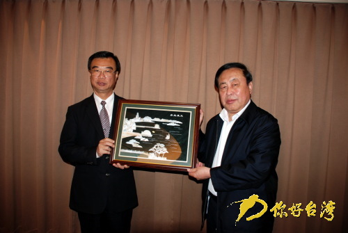 閻啟俊書(shū)記向吳伯雄榮譽(yù)主席贈(zèng)送青島貝雕工藝品(你好臺(tái)灣網(wǎng) 圖)