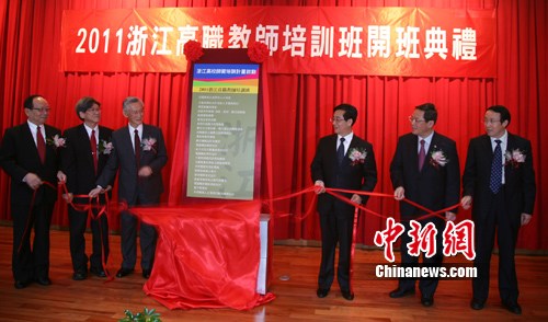 由浙江省高等教育學會和臺灣科技大學共同舉辦的 “浙江在臺高校師資培訓基地掛牌及2011浙江高職教師培訓班開班儀式”今天下午在臺北舉行。