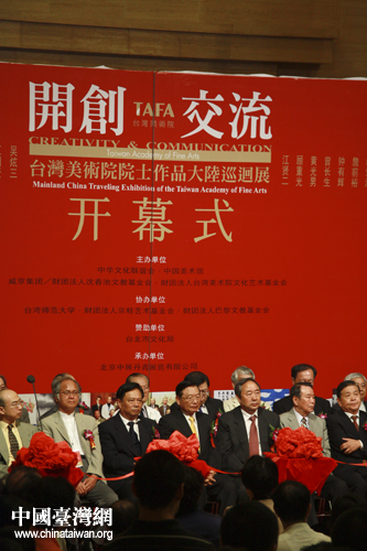 中國臺(tái)灣網(wǎng)8月22日北京消息 22日上午,由中華文化聯(lián)誼會(huì)、中國美術(shù)館、臺(tái)灣沈春池文教基金會(huì)、臺(tái)灣美術(shù)院文化藝術(shù)基金會(huì)主辦的《開創(chuàng)·交流——臺(tái)灣美術(shù)院院士作品大陸巡回展》在北京中國美術(shù)館隆重開幕。臺(tái)灣海基會(huì)董事長江丙坤、中華文化聯(lián)誼會(huì)顧問周和平、全國臺(tái)灣同胞聯(lián)誼會(huì)會(huì)長梁國揚(yáng)、海協(xié)會(huì)副會(huì)長王富卿等兩岸各界嘉賓300余人出席了展覽開幕式。