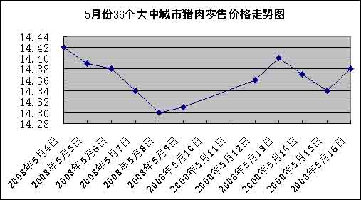 中國國家發改委網站消息,據發改委價格監測中心監測,上周(5.12-5.16,下同)全國36個大中城市豬肉(精瘦肉)平均零售價格每500克為14.37元,比前一周(5.5-5.9,下同)略漲0.21%。