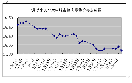 據國家發改委網站消息,發改委價格監測中心監測顯示,上周(8月4日~8月7日)全國36個大中城市集市、超市豬肉(精瘦肉)平均零售價格每500克為14.33元,與前一周(7月28日~8月1日,下同)持平。