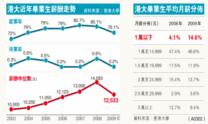 港大昨公布09年畢業(yè)生就業(yè)情況,在受訪的約3100名本科畢業(yè)生中,不計算醫(yī)生和牙醫(yī)等“高薪族”,09年畢業(yè)生薪酬中位數(shù)為12,533元,較08年急跌14.1%,返回06年水平。另外,學生就業(yè)率只有76.1%,較08年下跌4個百分點,與04年水平相若。