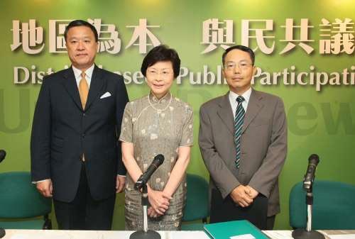 林鄭月娥(中)說,市建局日后供應(yīng)的單位,將以簡(jiǎn)約適中為主。圖左為張震遠(yuǎn)、右為羅義坤。圖片來源:大公報(bào)