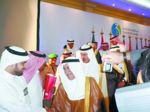 14日在新聞發布會開始前,沙特石油部長納伊米受到媒體“圍攻” 本報記者 朱周良 攝
