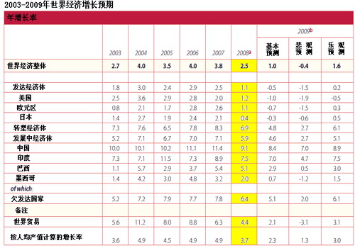 國際貨幣基金組織(International Monetary Fund,簡稱IMF)在11月6日發(fā)表的報告中再次下調(diào)了2008年全球經(jīng)濟(jì)增長預(yù)期,該組織預(yù)計,2008年全球經(jīng)濟(jì)增幅將放緩至3.7%,2009年將放緩至2.2%,遠(yuǎn)遠(yuǎn)低于3%這一IMF認(rèn)為的全球經(jīng)濟(jì)陷入衰退的分水嶺。IMF將美國2008年經(jīng)濟(jì)增長預(yù)期下調(diào)至1.4%,將歐元區(qū)經(jīng)濟(jì)增長預(yù)期下調(diào)至1.2%,將日本經(jīng)濟(jì)增長預(yù)期下調(diào)至0.5%,將新興市場及發(fā)展中國家2008年的經(jīng)濟(jì)增長預(yù)期從6.9%大幅下調(diào)至6.6%,不過對中國經(jīng)濟(jì)在2008年的增長預(yù)期仍維持在9.7%不變。報告中認(rèn)為,發(fā)達(dá)國家經(jīng)濟(jì)將在2009年全年陷入萎縮,降幅為0.3%,這將是自第二次世界大戰(zhàn)(World War II)以來發(fā)達(dá)國家經(jīng)濟(jì)首次出現(xiàn)全年負(fù)增長。聯(lián)合國在12月10日發(fā)表的《2009世界經(jīng)濟(jì)展望報告》中對主要經(jīng)濟(jì)體增長率做出了如下預(yù)測: