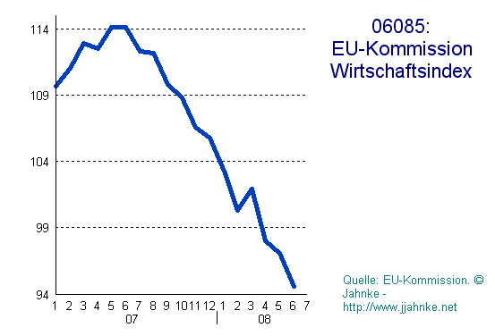 歐盟委員會發布的的經濟敏感指數走勢圖,體現生產者和消費者對經濟前景樂觀程度(2007年1月-2008年7月)