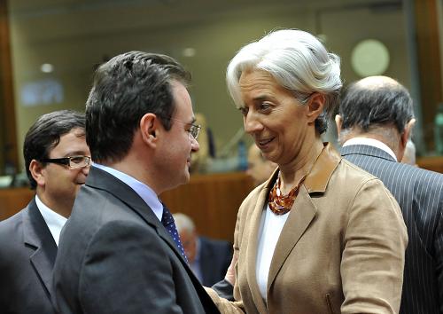 5月9日,在比利時首都布魯塞爾,法國經(jīng)濟(jì)、財政與就業(yè)部長拉加德(右)與希臘財政部長帕帕康斯坦季努在歐盟財政部長特別會議舉行前交談。當(dāng)天,歐盟舉行財長特別會議,討論捍衛(wèi)歐元穩(wěn)定、增強(qiáng)市場信心的具體實施方案。不斷升級的希臘債務(wù)危機(jī)和歐盟其他國家高額的公共債務(wù),使得市場對歐元區(qū)和歐元的前景普遍擔(dān)憂。今年以來,歐元兌美元匯率已經(jīng)下跌超過10%。歐盟機(jī)構(gòu)和歐元區(qū)國家領(lǐng)導(dǎo)人在7日特別峰會后表示將“不惜一切代價”捍衛(wèi)歐元和歐元區(qū)的穩(wěn)定。新華社記者武巍攝