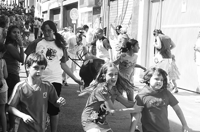 8月26日,圣塞巴斯蒂安·德·洛斯雷耶斯專為兒童舉辦了奔牛節(jié)。圖為孩子們正在和人力控制的“奔牛”賽跑。 人民網記者 丁大偉攝
