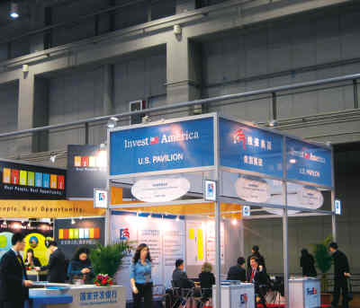 圖為中國對外投資合作洽談會上的“投資美國”主題展位。 尹曉宇攝
