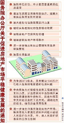 伴隨著房地產市場的回升,近期部分城市房價過快上漲等問題引起決策層高度重視。國辦10日發出《關于促進房地產市場平穩健康發展的通知》。這份2010年房地產市場調控藍圖蘊涵哪些新看點呢?