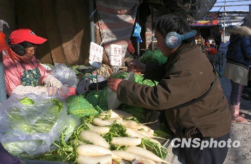 1月4日,北京一個大型菜市場,“堅守崗位”的菜商正與不畏嚴寒的顧客達成交易。受大雪影響,北京菜價普遍上漲。前一日的罕見大雪造成的降溫和交通不便使市民不愿出門買菜,許多菜商也沒有出攤。1月3日,京津冀普降大雪,局地降暴雪。北京天津的降雪量為1951年以來同期最大。根據預測,1月5日北京氣溫或將降至-16℃,為30年來同期最低值。 中新社發(fā) 蘇丹 攝