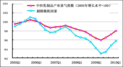 2010年一季度,中經乳制品產業景氣指數為98.1點(2005年增長水平=100),比上季度上升0.8點,比上年同期提高1.6點;中經乳制品產業預警指數為80.0點,比上季度下降20點,處于“淺藍燈區”內運行。