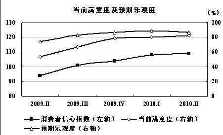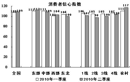 二季度農(nóng)村消費者信心進一步增強,城市消費者信心有所回落。在去年以來持續(xù)大幅上升的基礎上,二季度農(nóng)村消費者信心又提高了6點,達到117。“上半年,一系列促進農(nóng)業(yè)生產(chǎn)、農(nóng)民增收的政策實施對農(nóng)民信心的提升產(chǎn)生了一定的作用,很多省市最低工資水平的提高和農(nóng)民工工資的增加增強了農(nóng)民工對未來收入的樂觀預期。” 國家統(tǒng)計局中國經(jīng)濟景氣監(jiān)測中心副主任潘建成說。