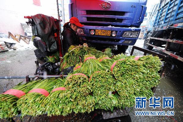 長沙市馬王堆蔬菜批發市場的商販在整理蔬菜(1月19日攝)。連日來,湖南長沙遭遇罕見冰雪天氣,市區持續低溫。當地蔬菜供應充足,價格基本保持穩定。 新華社記者 龍弘濤 攝