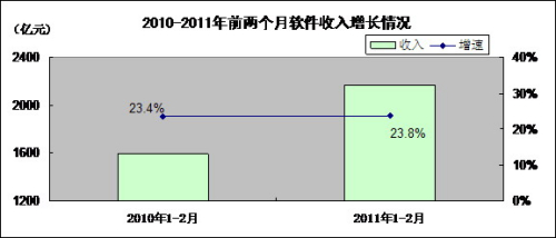 中新網3月25日電今天,工信部發布1-2月軟件業經濟運行情況,數據顯示,2011年1-2月,我國軟件產業實現軟件業務收入2167億元,同比增長23.8%,增速比去年同期提高0.4個百分點。完成利潤總額271.5億元,同比增長31%,增速比去年同期高20.1個百分點。