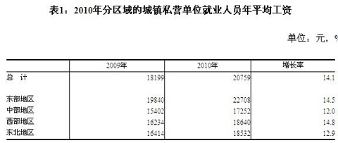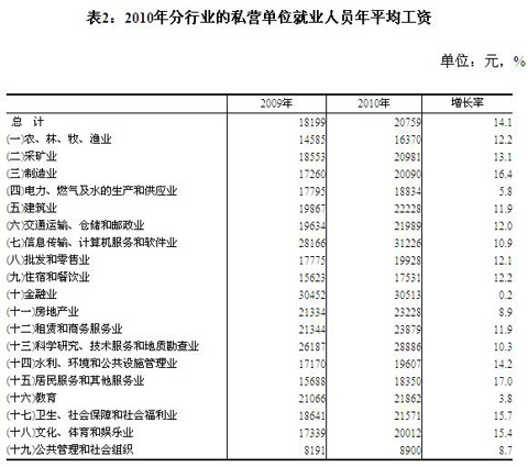 統(tǒng)計局日前公布了2010年城鎮(zhèn)私營單位就業(yè)人員年平均工資統(tǒng)計數(shù)據(jù)。數(shù)據(jù)顯示,2010年全國城鎮(zhèn)私營單位就業(yè)人員年平均工資為20759元,與2009年的18199元相比,增加了2560元,同比增長14.1%,增幅提高7.5個百分點(diǎn)。私營單位就業(yè)人員年平均工資低于城鎮(zhèn)非私營單位在崗職工平均工資,但增長速度高于非私營單位0.6個百分點(diǎn)。