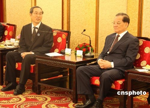 廣西壯族自治區主席馬飚五月二十一日率領廣西經貿文化代表團乘坐包機飛抵臺灣,他是大陸第一個率團赴臺進行經貿文化交流的正省級官員,此行是海峽兩岸交流史上的新突破。國民黨榮譽主席連戰(右)在臺北圓山飯店會見馬飚(左)主席一行。 中新社發 耿軍 攝