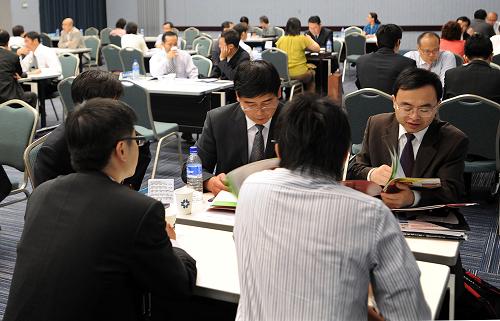 6月1日,兩岸企業代表在臺北參加“三下鄉商機 兩岸經貿合作洽談會”對口洽談活動。當日,被臺灣媒體譽為“采購首發團”的“兩岸經貿促進考察團”展開在臺的系列政策說明及采購洽談活動。在臺期間,35家大陸知名企業將與臺灣的200多家企業進行460多場對口洽談。此次來臺考察和洽購的大陸企業由海峽兩岸經貿交流協會與大陸家電、機電、輕工、紡織、五礦等多家商協會共同組織,參團的企業主要由“家電下鄉”中標企業及輕工、食品加工和銷售企業組成。新華社發(吳景騰 攝)