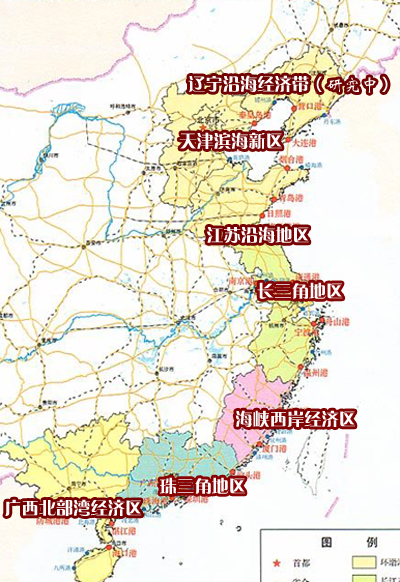 《江蘇沿海地區發展規劃》近日經國務院常務會議原則通過,上升為國家戰略。此前,《推進天津濱海新區開發開放有關問題的意見》、《廣西北部灣經濟區發展規劃》、《進一步推進長江三角洲地區改革開放和經濟社會發展的指導意見》、《珠江三角洲地區改革發展規劃綱要》、《關于支持福建省加快建設海峽西岸經濟區的若干意見》也相繼獲國務院常務會議原則通過上升為國家戰略。另據了解,對遼寧沿海經濟帶的發展規劃也正在研究中。